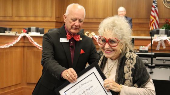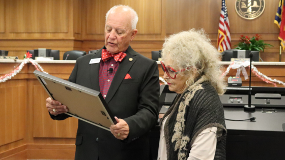 Image of Chairman Bob Woodard presenting the Certificate of Appreciation to Carol Ann Angelos.