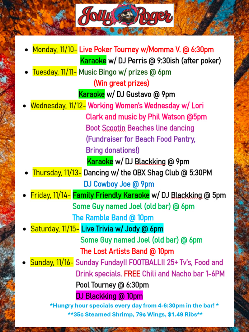 DAILY, WEEKLY AND MONTHLY: Events, live music and food specials at the Jolly Roger Restaurant & Bar.