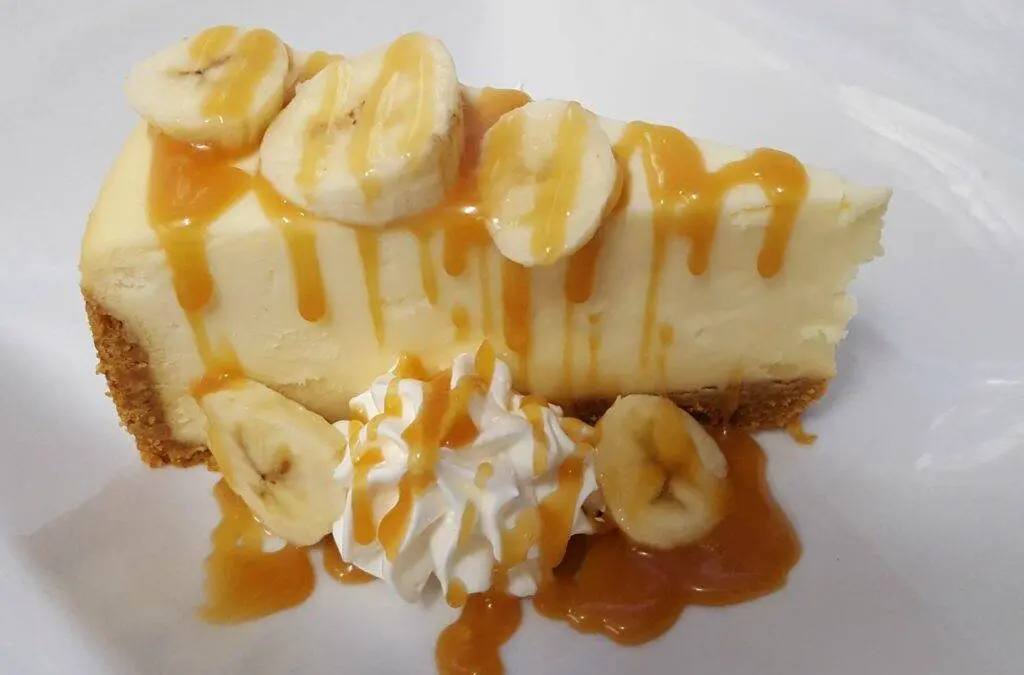 Caramel flavored cheesecake swirled with banana puree, baked in a graham crust, topped with caramel and whipped cream.